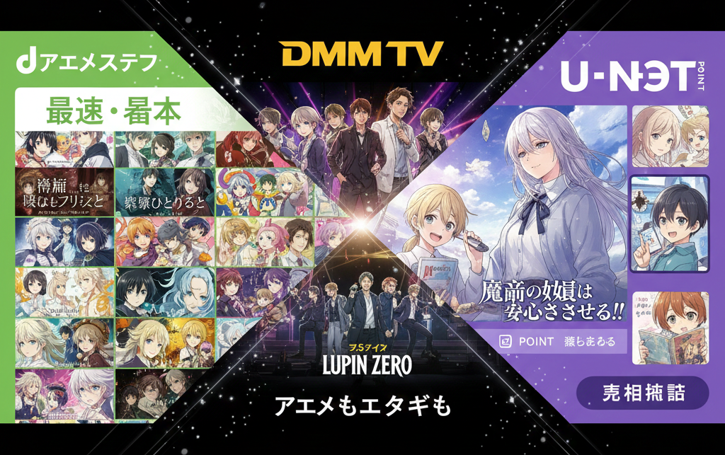 - 調査結果: ビットレート(画質)が高く、特に深夜アニメの美しい映像を大画面で見るなら右に出るものはいません。毎月1,200円分のポイントがもらえるため、実質989円。「原作マンガをポイントで買う」人なら、実は最強の選択です。